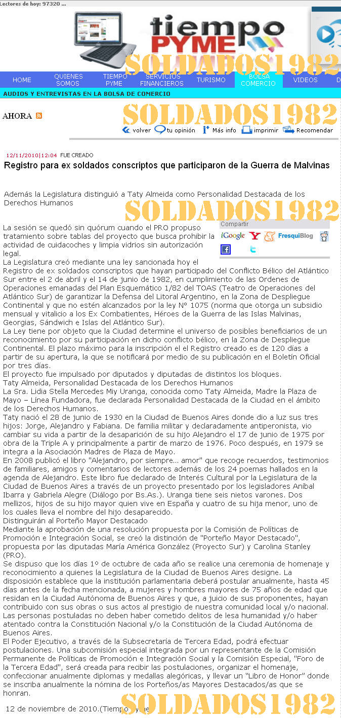 Actualización: La nota sobre la sanción de la ley para empadronar a los ex-soldados TOAS en la Ciudad de Buenos Aires formó parte de la edición del sábado 13 de noviembre de 2010 del portal Límite Informativo de la ciudad de Posadas en la provincia de Misiones.